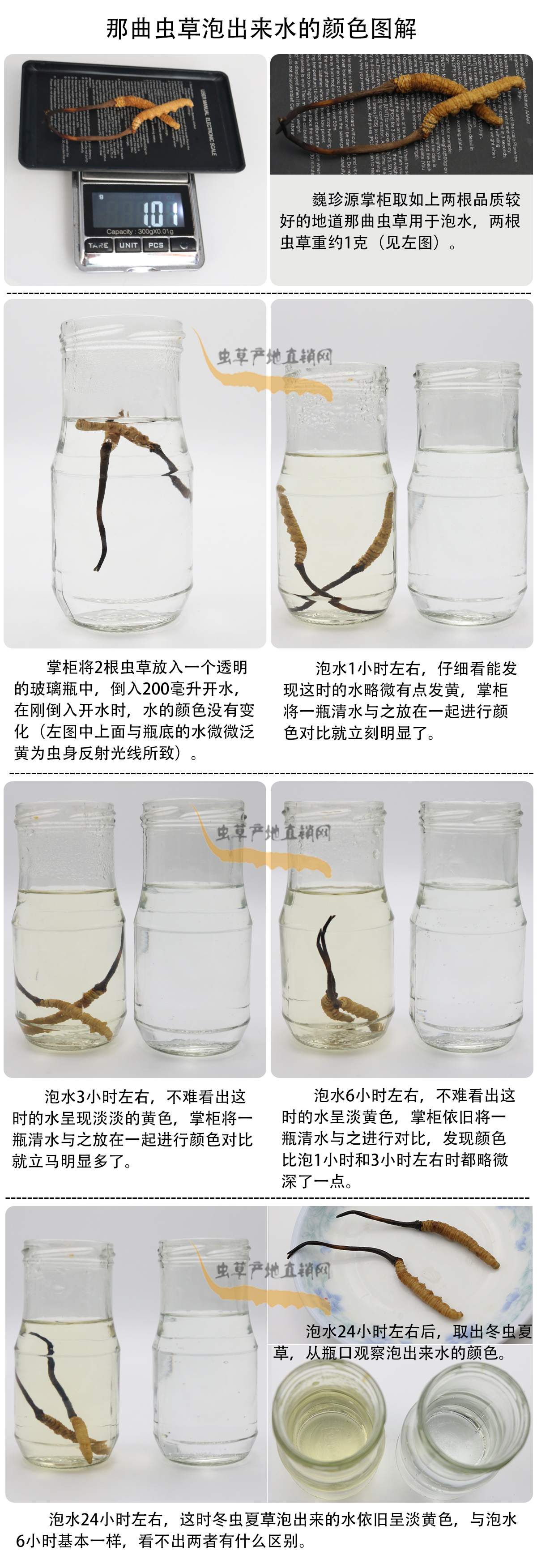 冬蟲夏草泡水是最常用的服用方法,有些細心的顧客在冬蟲夏草泡水過程中觀察水的顏色變化,并向我們提出了一些疑問。為了掌握第一手資料,更客觀準(zhǔn)確的回答大家的疑問,巍珍源掌柜親自試驗冬蟲夏草泡水過程(以那曲冬蟲夏草作為試驗樣本),并拍下水的顏色變化照片,請大家先看照片,然后巍珍源掌柜再就幾個重要問題進行解答,照片如下: